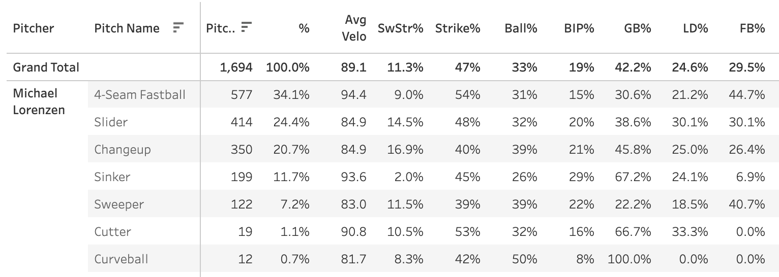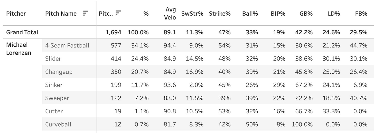 Michael Lorenzen also had a successful debut with a new team, getting the win for the Phillies in eight strong innings. He had just 10 whiffs on a 9.9% SwStr% and a 47.5% Strike%, so pretty mediocre numbers there - but he’s been having success this way for most of the year. Here’s the pitch mix: