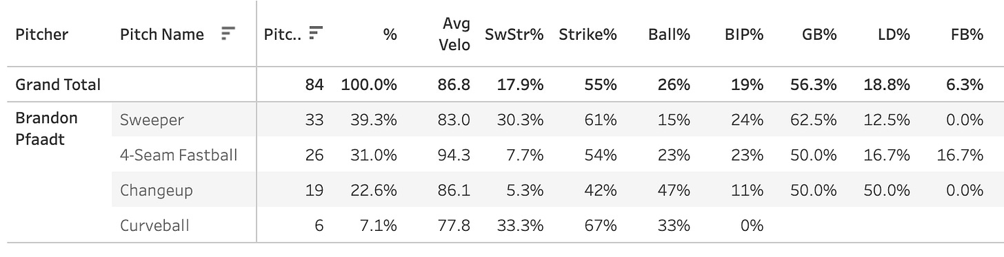 Brandon Pfaadt finally put up a big start. Seven innings, one run, 7:1 K:BB. He also did it with a pitch mix change, throwing the sweeper way more, and that worked very well.