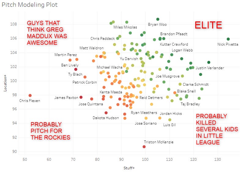It can be kinda fun to classify guys by their Stuff+ and Location+ combinations. Gil would classify as “great stuff, bad locations”. Some of those other guys:
