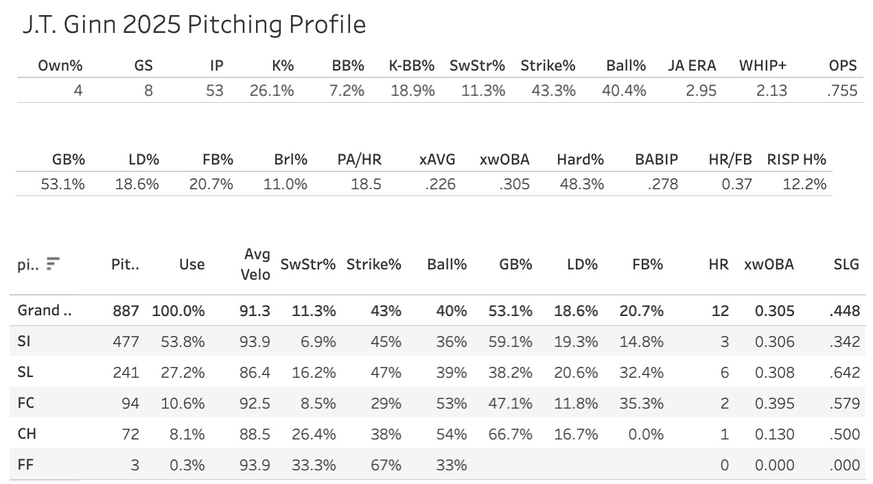 I think Ginn can be a pretty good pitcher someday. The sinker is heavy and it has a ton of movement. It just looks like one that’s really hard to hit, and the numbers bear that out with a .342 SLG allowed on the pitch on a .306 xwOBA.