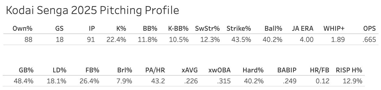 I do think he’s a 9-10% BB% going forward given the 37% Ball% and the volume of the non-fastballs, but he’s looking like an easy top 40 SP for next year, which I never saw coming.