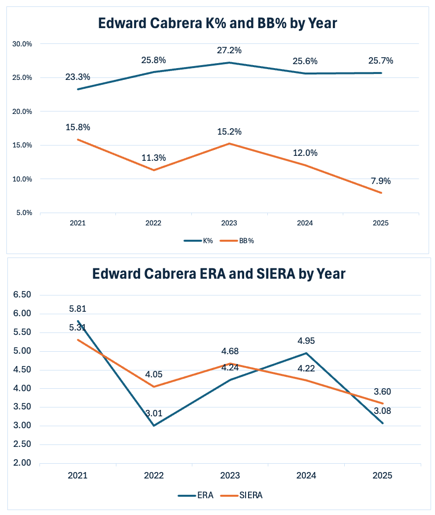 The walk rate is down under 8%. We can officially stop calling him Edward CaBBrera. He has a 12.9% SwStr%, a 37% Ball%, and a 49% GB%. That’s a really strong trio.