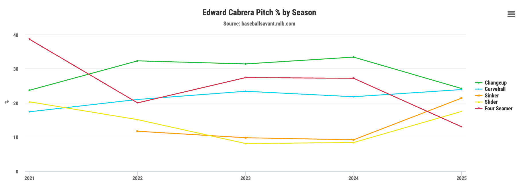 Cabrera has always been a weird pitcher. And he’s weird enough to reduce fastball usage and then drastically reduce the walk rate. That usually works the opposite way. The fastball is the easiest pitch to throw for a strike. But I’m not going to argue with the results. He’s at a 1,729 pitch sample now.