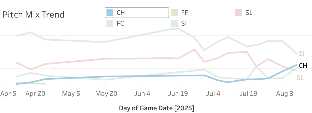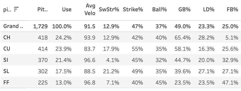 The four-seamer has been insanely good with a 60% Strike% and a 20.5% SwStr%. Who needs mid-90s!