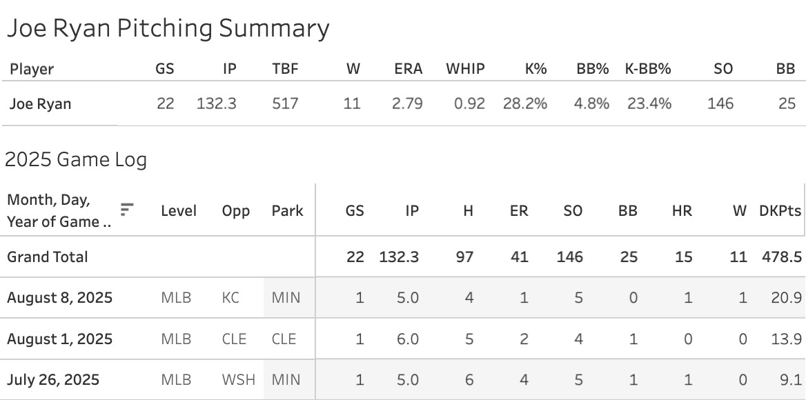 Carson Whisenhunt (4.0% Owned): Projected 5.45IP 2.12ER 6.03SO 1.94BB 17.61FPts