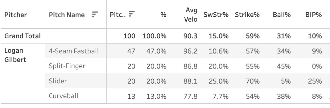 1. Logan Gilbert (SEA): 59.0 Strike%, 31.0 Ball%