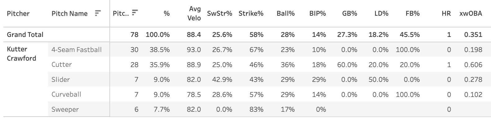 2. Kutter Crawford (BOS): 57.7 Strike%, 28.2 Ball%