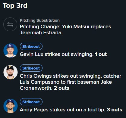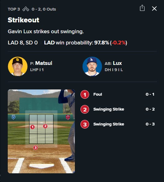 For whatever reason, it only inserted rows into the JSON data (shout to you if you know what I’m talking about) based on the outcome of the plate appearances. Matsui threw 12 pitches, but when you look at each PA you’ll only see the three strikes recorded: