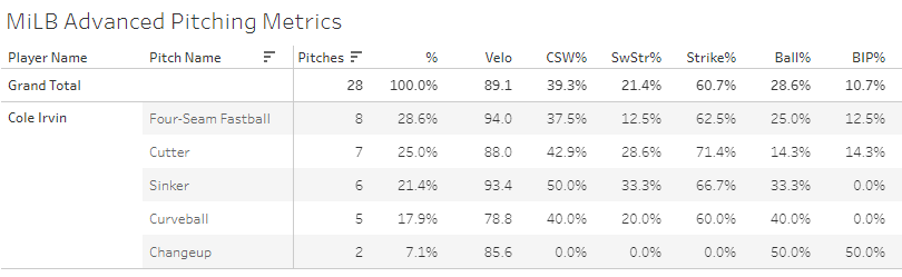 He was asked about it and did comment that he made a lot of changes over the off-season. Irvin is 30, was not in the original projected rotation, and has a career 4.59 SIERA, so it would make a lot of sense for him to try some stuff to change his game this off-season. And I guess he did that. Will it matter? I doubt it! He’s been around since 2019, if he could just change some stuff and get better I’d think he would have done that a few years ago. But it’s not impossible, there’s certainly more analytics and whatnot around these clubs this year than in prior years, so maybe someone picked something out, and maybe it will matter. Here’s how the full arsenal looked: