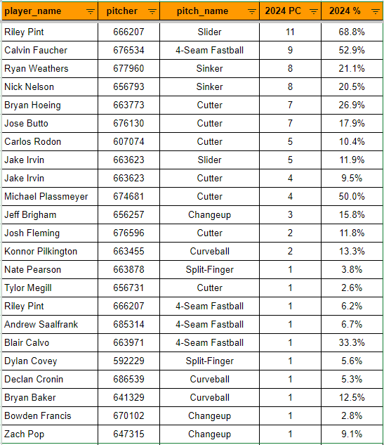 New Pitches: This locates new pitches that have been throw in spring that weren’t thrown in the Major Leagues in 2023