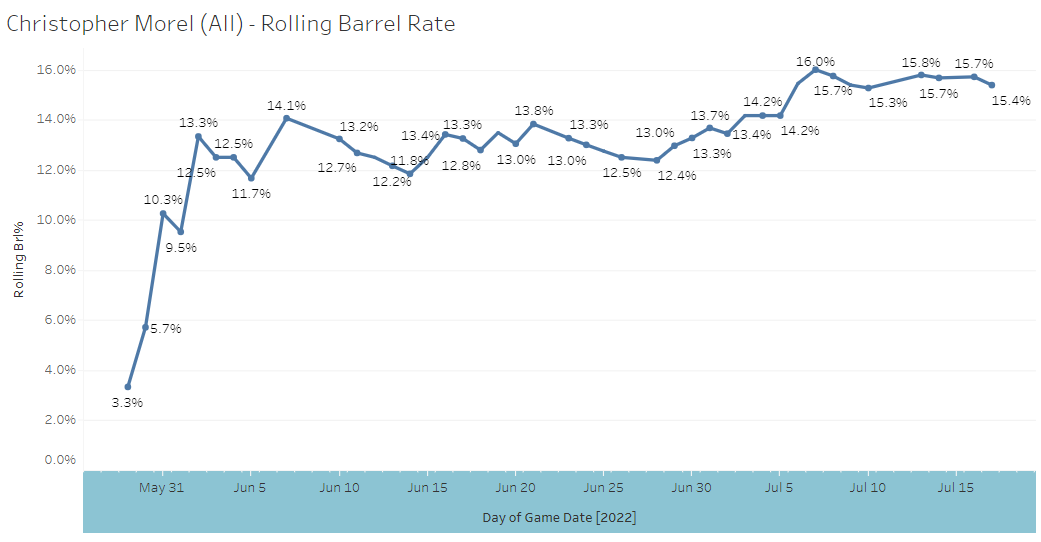 This has nothing to do with yesterday but what the heck - Chris Morel has a 15.4% Barrel Rate this year. I would’ve guessed like 7%. He started hot with the barrels but then was just awful in mid-June, but now he’s been great again.