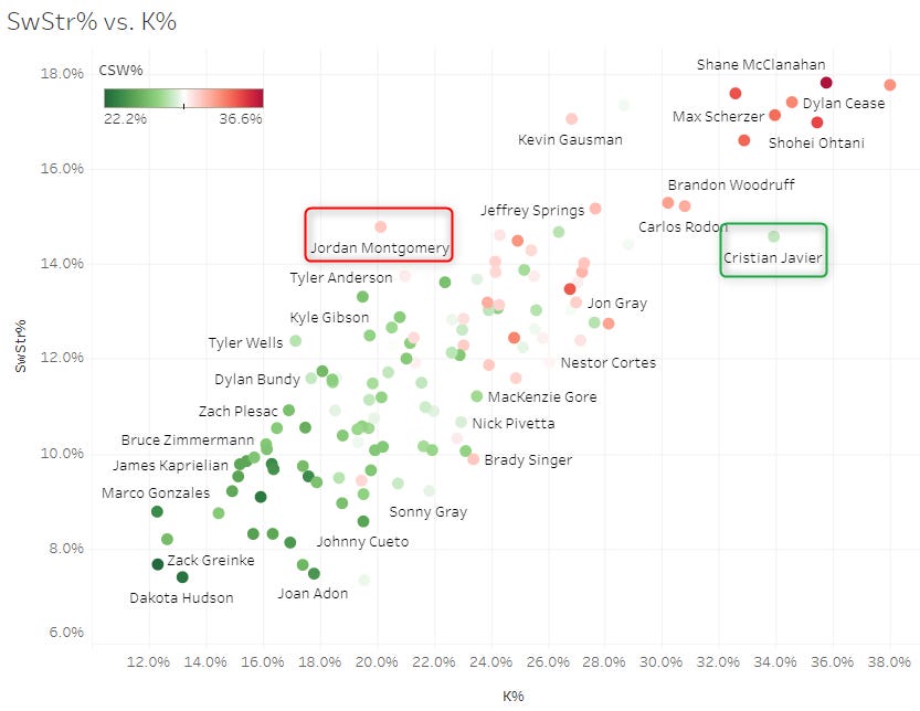 Both of these dots fall far away from the trend line, on opposite sides. Montgomery’s 14.8% SwStr% was elite and has me really confused about the low 20% K%. Conversely, Javier had a lower 14.6% SwStr% but a huge 33.9% K%.