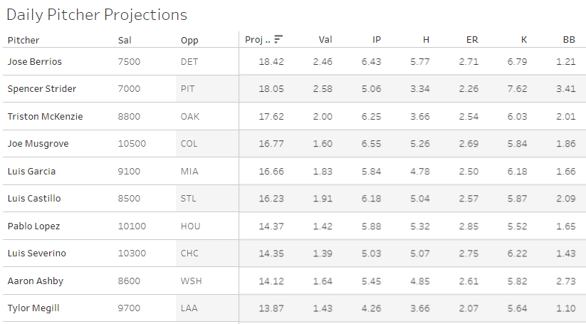 Fifteen games tonight and they all start after 7 pm eastern. This will be the first 15-game DFS slate of the year, and I’m here for it. It’s also quite fun that the three top projected arms are Berrios, Strider, and McKenzie. All three of those guys are priced pretty low on DraftKings and in smash matchups (matchups!). Should be a fun slate - and I’ll be very interested to see how the ownership shakes out on those two guys. Here are the top 10 pitcher projections for the model’s first run this morning: