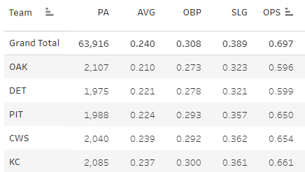 To go further on that matchup stuff, I noticed yesterday how laughably bad the Athletics and Tigers have been this year. I apply my JA scoring model to team offenses every day, and it ranks the teams. The bottom five offenses right now look like this:
