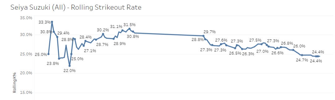 Seiya Suzuki - 79 PA, 15.2 K%, 15.3 Brl%