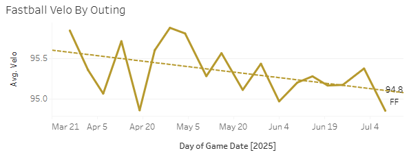 He has just a 13.2% K-BB% in his last seven starts with a 3.80 JA ERA. The fastball velo has been trickling down, and it bottomed out yesterday.