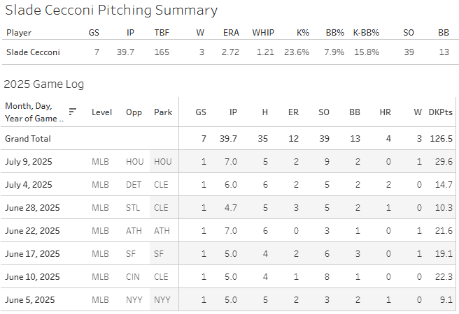 7. Slade Cecconi (CLE): 51.0 Strike%, 32.7 Ball%