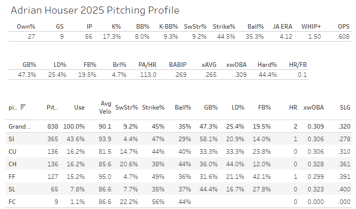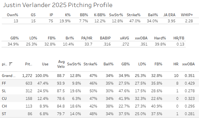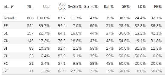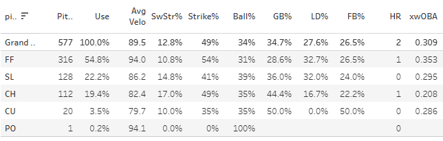 That’s six starts wtih a 2.99 JA ERA on a 12.8% SwStr% and a 33.6% Ball%. Here’s the pitch mix stuff from that sample: