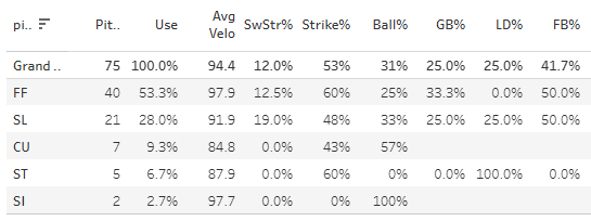 That is a big strikeout performance. He came out with the big 98mph fastball and had a good day of it with a 60% Strike% and a 25% Ball%. And he added six whiffs with the slider.