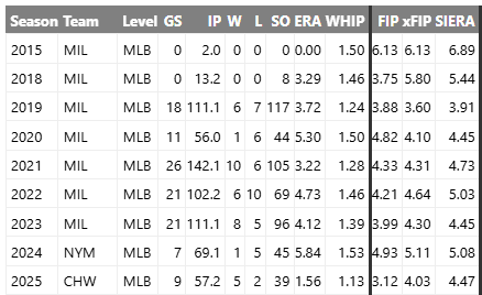 The 2.72 ERA is good, but a bit lucky with the 15.8% K-BB%. The full season stuff from the main dashboard: