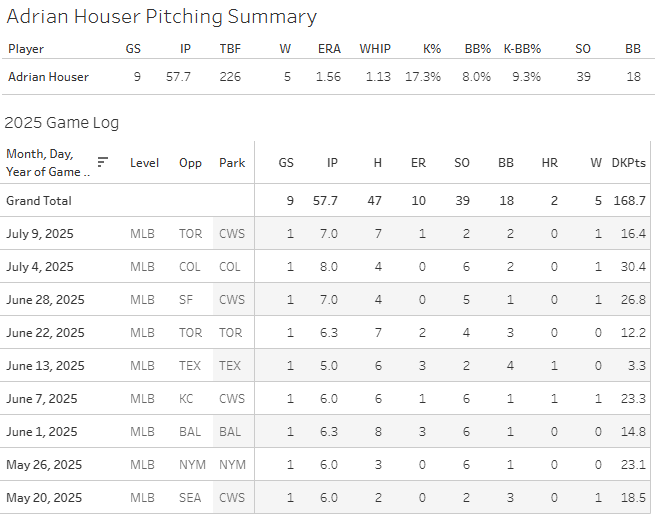 The people have begun asking about Adrian Houser. He now has a 1.56 ERA with a 1.13 WHIP in his nine starts with the White Sox.