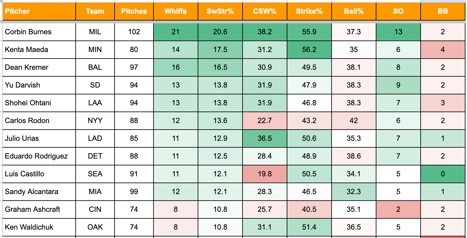 But Maeda just beat him out in Strike% at 56.2%. Great stuff from both of those pitchers, but extra good to see Burnes having a big whiff day - because those have been down a lot this year.