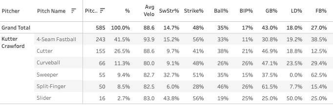 Kutter Crawford was also great with a 19.1% SwStr% and a 53.9% Strike%. He’s a guy I’ve liked for awhile, although the fantasy results really hadn’t come before yesterday. Here’s his pitch mix data since 6/1 (we shouldn’t look at the earlier parts of the season with him because he was in a bullpen role):