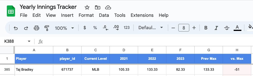 Taj Bradley had an encouraging start against the Rangers. He threw 95 pitches (most importantly, maybe) and had a nice 14% SwStr% and a 55% Strike%! He’s shown that ability to throw a bunch of strikes while getting a bunch of whiffs a lot this year, which makes me really excited for his future - but he’s also clearly shown plenty of downside. I’m also not sure how many more innings he’s going to get with the Rays - but that might not actually be a concern because he’s still 50 innings short of what he did last year: