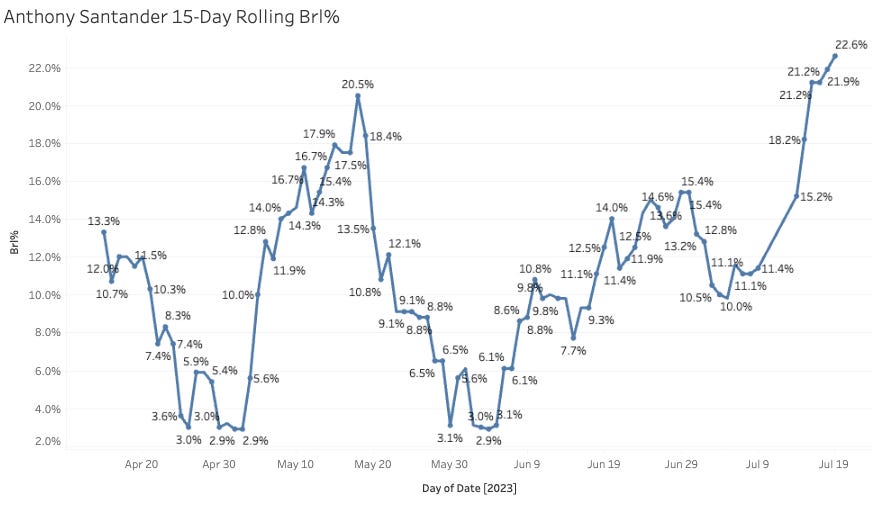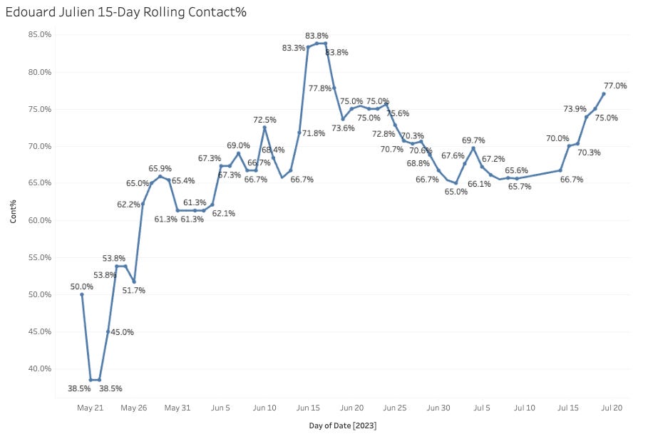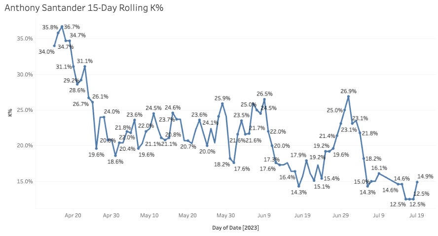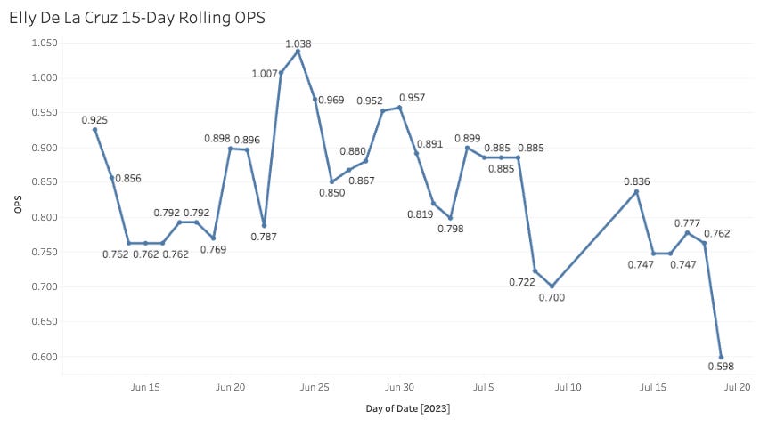 Elly De La Cruz has fallen on hard times. He is just 1/25 since the All-Star Break and has a .600 OPS in July. For the year: