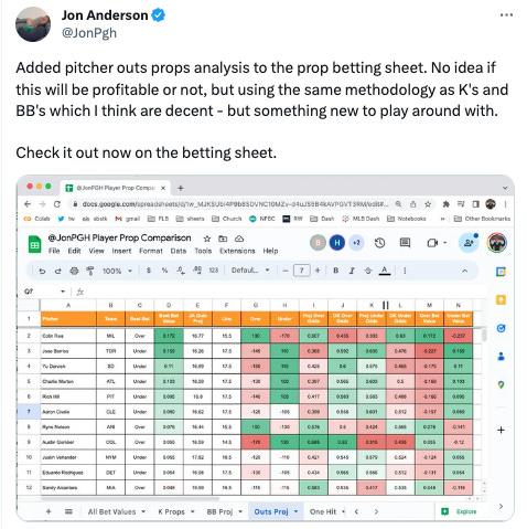 Also debuted PITCHER OUTS PROPS yesterday. It’s been added to the Player Prop Comparison sheet