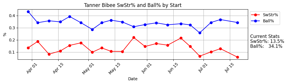 I’m not sure if something changed, but all of a sudden, the strikeouts are gone. He has just a 22% K% and 9.0% SwStr% in his last four starts. That was after putting up a 36% K% in his previous five starts. I guess this is one of those stories about guys without great fastballs. He’s not nearly as bad as a guy like Reese Olson, who we talk about all of the time, but Bibee definitely does not have a great heater, and that puts a lot of pressure on the secondaries and opens up doors for potential failures.