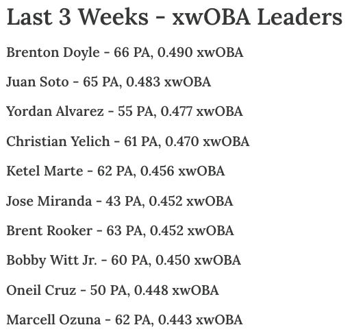 Another dinger from Brenton Doyle, who now leads the “Last 3 Weeks xwOBA” board: