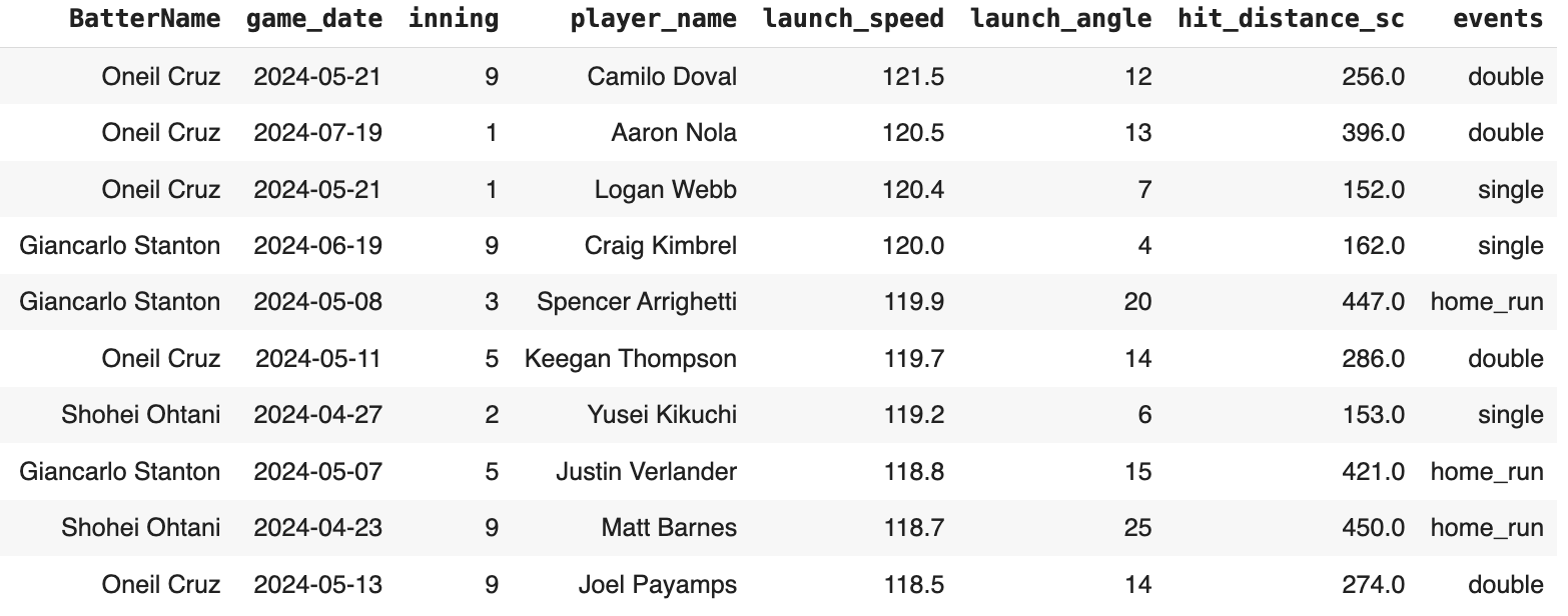 Oneil Cruz hit a ball 120.5, the second-hardest hit ball of the year. He now has half of the top ten. Only three unique names are on the top ten, with Stanton and Ohtani joining Cruz.