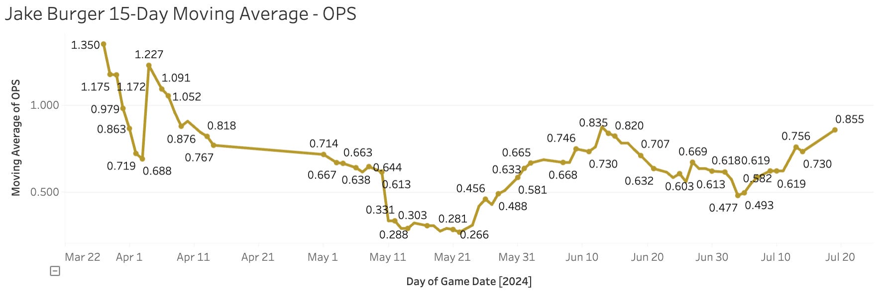 Is Jake Burger getting it going? He homered yesterday, his fourth of July.