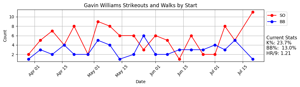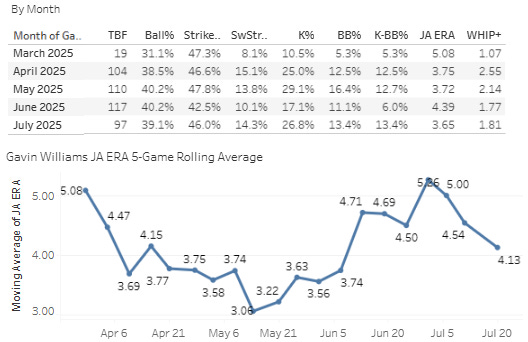 There is not a ton to say. Gavin Williams had his best start of the season yesterday, but it came in that nice matchup with the road Athletics. The A’s are hitting .230/.289/.417 with a 25% K% on the road since June 1st. They still hit some dingers (9.1% Brl%, 26 PA/HR), but if you can keep the ball in the park you’re in really good shape in that matchup.