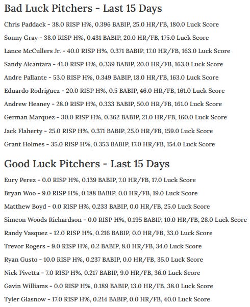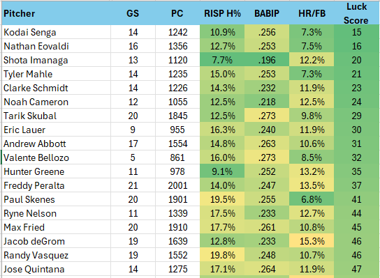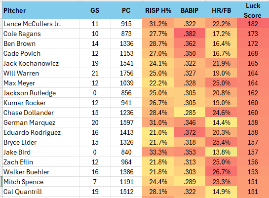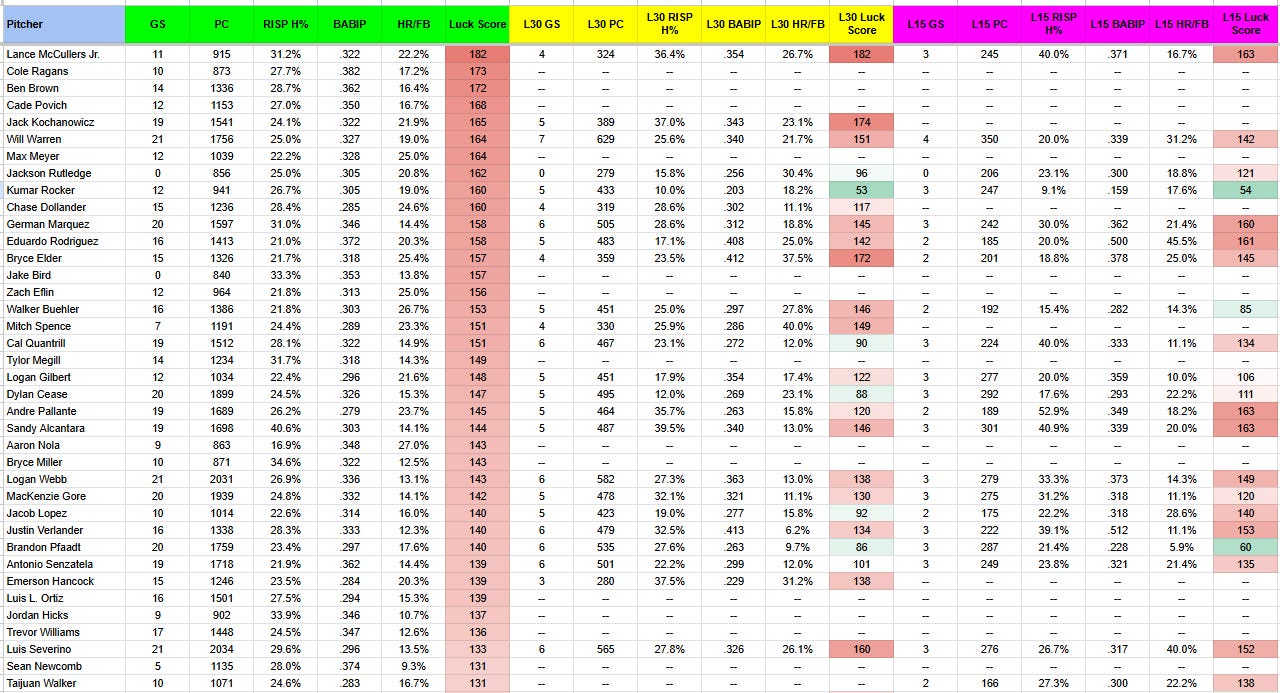 Guys like Skubal, Skenes, Fried, etc. will probably consistently turn in more favorable luck scores. They are guys who generate soft contact consistently. So there’s a pitfall of this, but it’s a pretty tough thing to workaround. But just keep that in mind when you’re looking at this data. Some pitchers can do things other guys can’t do because of consistently great command.