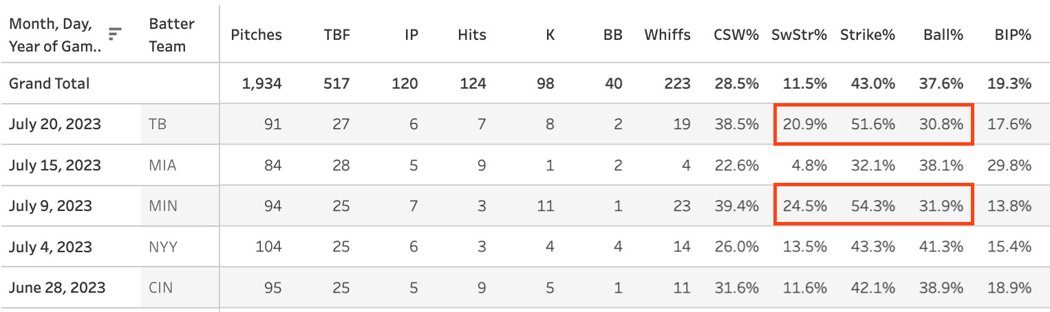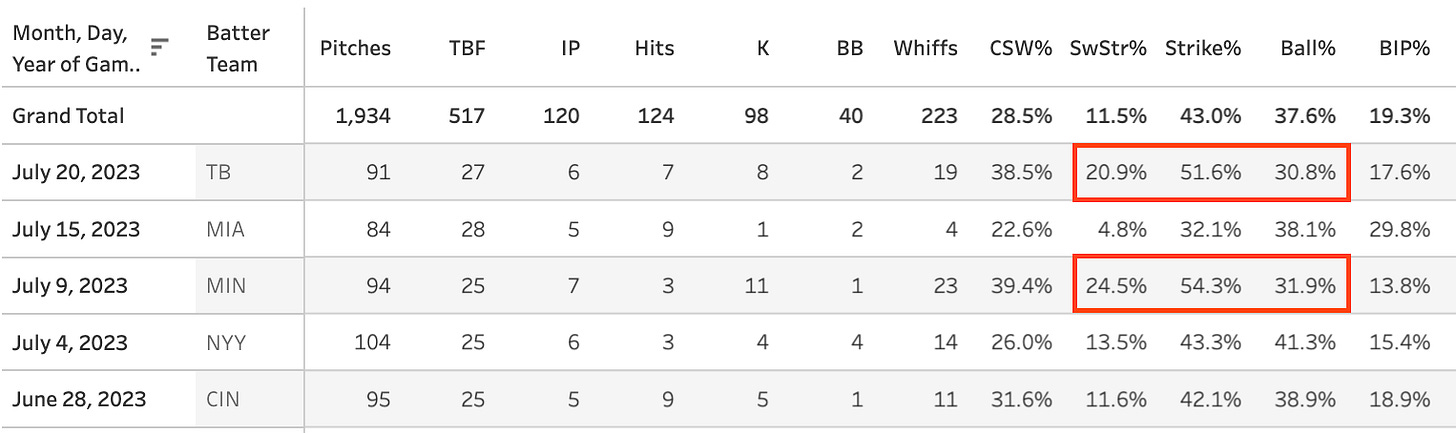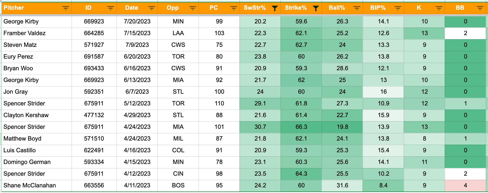 George Kirby had one of his best outings with 10 strikeouts and, of course, no walks. A 20.2% SwStr%, a 59.6% Strike%! Filtering down on the 2023 Individual Start Google Sheet for starts with 20%+ SwStr% and 59%+ Strike%: