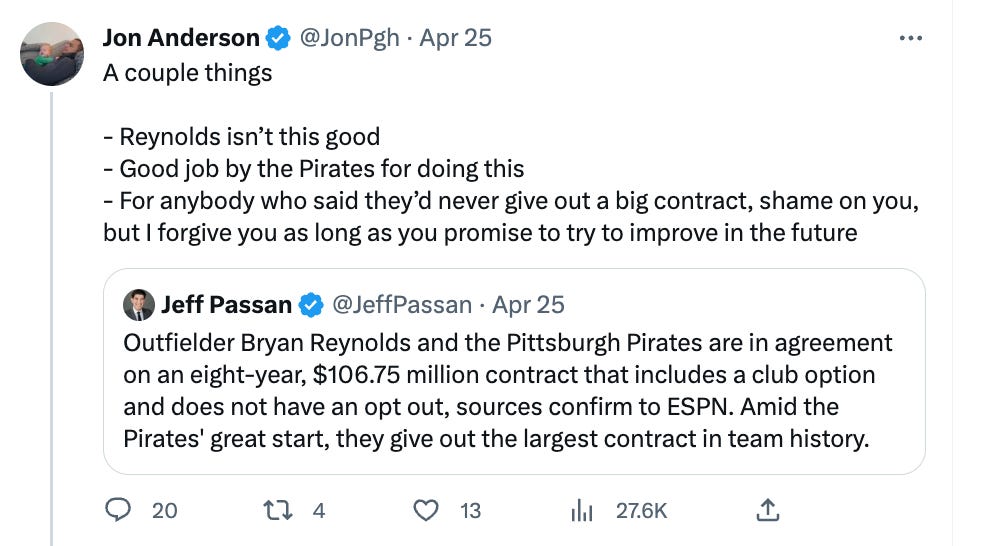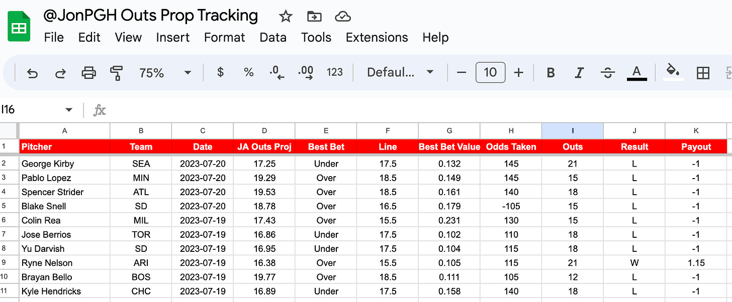 Also lost our two recommended BB and K bets, so another bad day on the algo prop betting front. But the good news is, I’m not betting any of these myself - so shout out to me! It’s pretty fun for me to track every day so I’m going to keep doing it: