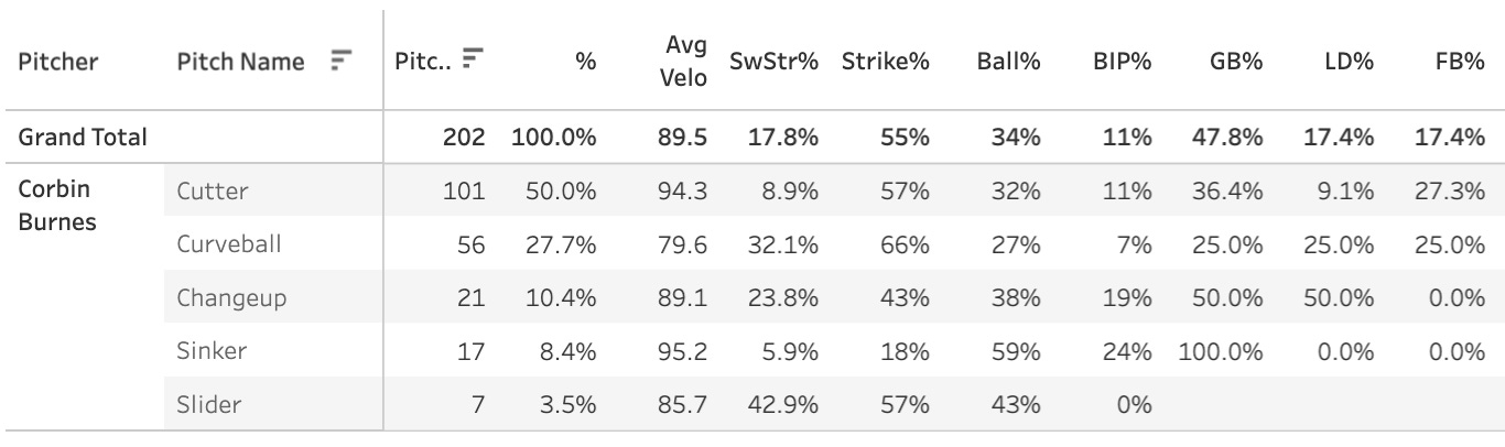 9 GS, 26.4% K%, 8.5% BB%, 12.9% SwStr%, 47.9% Strike%, 36.2% Ball%, 23% GB%, 24% LD%, 44% FB%, 9.4% Brl%, .291 xwOBA, .192 BABIP