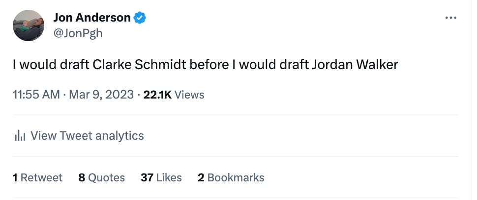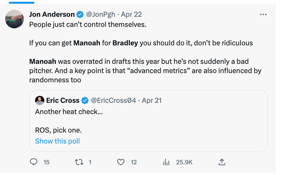 And then Tyler Glasnow added nine strikeouts and zero walks to his season total, bringing him to an elite 34.9% K% and a 7.9% BB% on the year. That 27.1% K-BB% puts him behind only Strider when filtering to pitchers with 8+ starts. Top five pitcher when healthy!