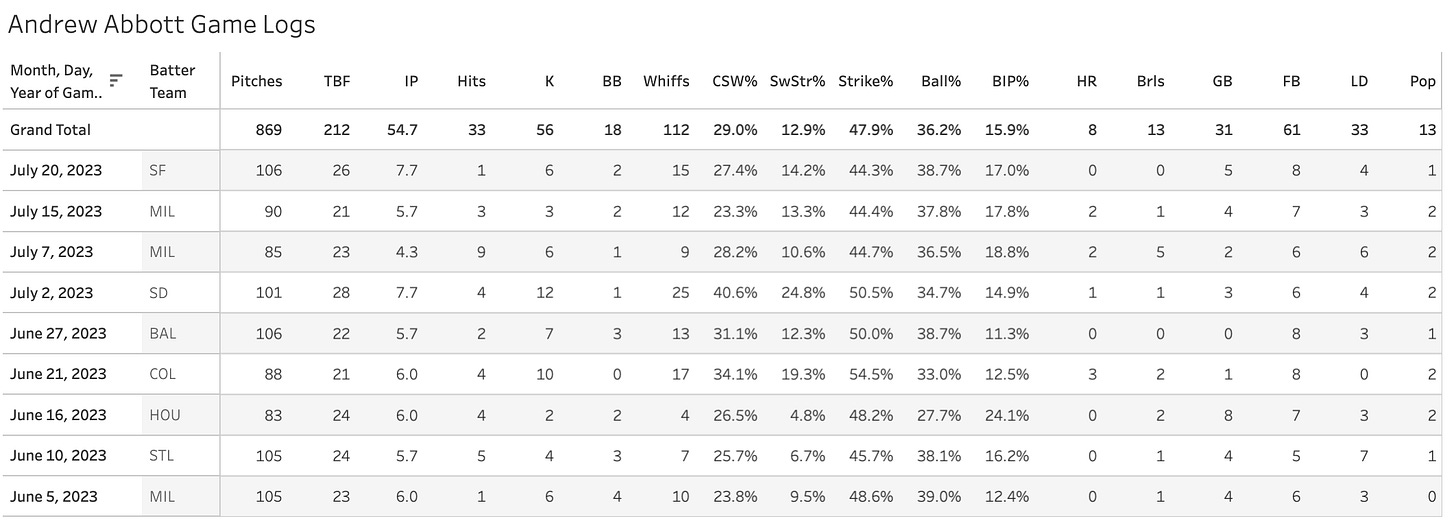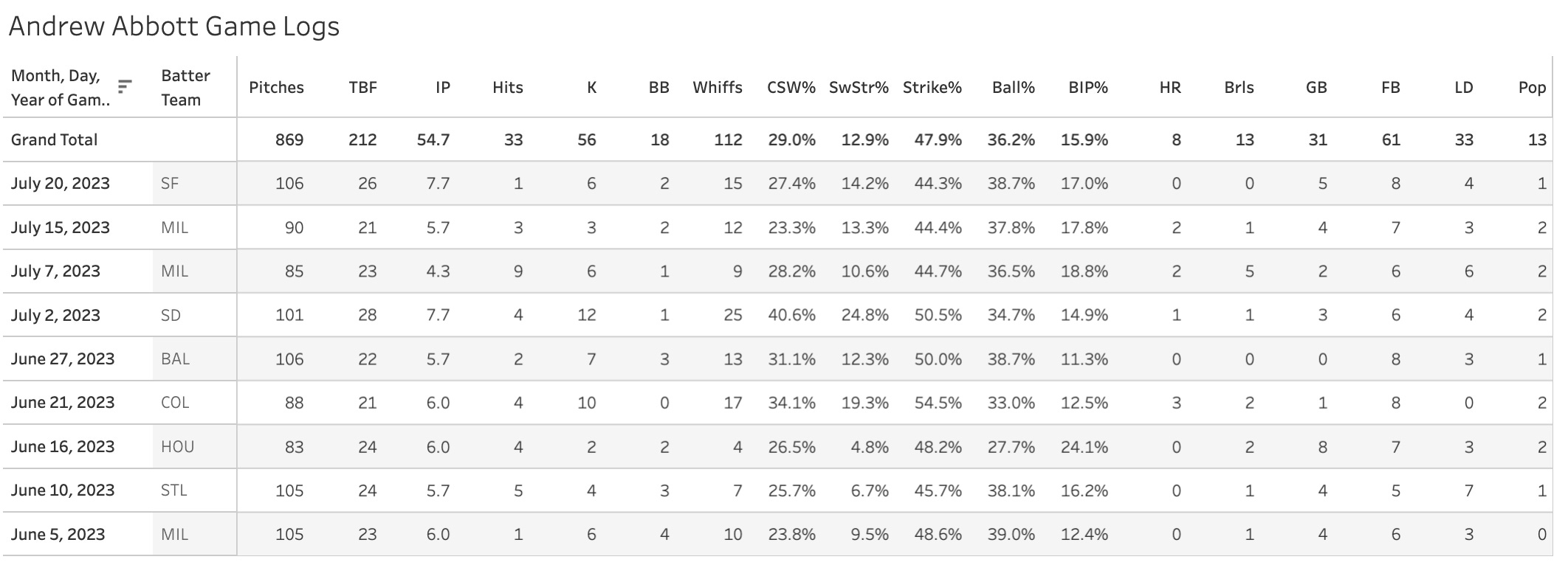 Abbott is really putting me through the ringer this year. Here’s his full game log from the “P Logs” tab on the dashboard.