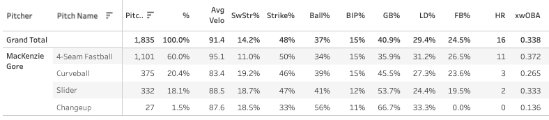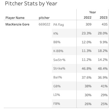 MacKenzie Gore is pretty similar to the Luzardo in that he’s a young lefty that’s been able to get a lot of strikeouts. He has not made the drastic improvements in strike-throwing that Luzardo has, but he has made some.