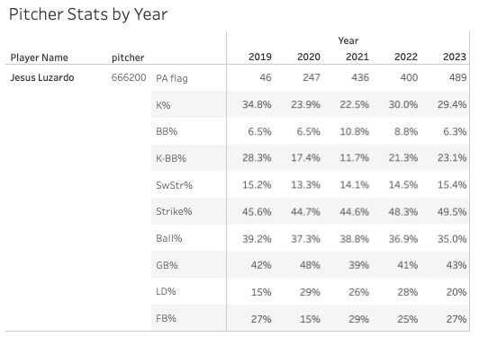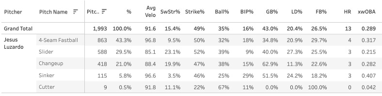 Even last year the BB% was more than good enough around 9% - that’ll play fine with a 30% K%. But now he’s dropped it to 6% and only lost a point on the K% - and the Strike% is quite good. These are ace-type numbers, and maybe that’s just who Luzardo is now!