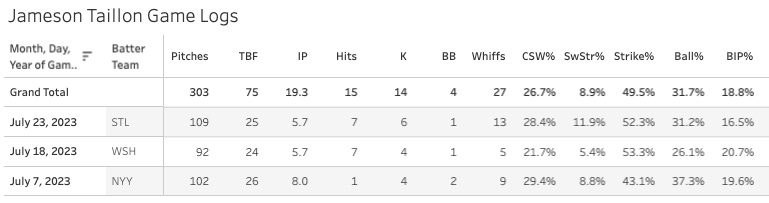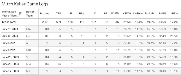 Okay actually I misspoke, he has been drastically better in 2023 as compared to 2022, but that’s because he was pretty bad in 2022. An 18.2% K-BB% with a 48.4% Strike% and a 14.2% SwStr% shows us a very good pitcher. The walk rate has been falling. In his first ten starts he went for a 12% BB%. In the last ten, it’s 7.5%.