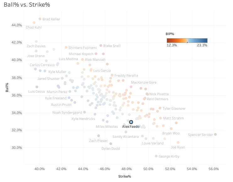 He throws a bunch of strikes, as we see above. The SwStr% is low at 10.9%, but the 15% K-BB% certainly keeps him away from the league’s really bad pitchers. Anybody throwing that many strikes always gives themselves a chance to have good outings. The only way you can’t possible make an out is if you walk a guy, and Faedo doesn’t do that very much. The K% is still a long way away from where we want it, but he’s an interesting streamer/deep league guy to keep an eye on.