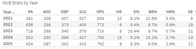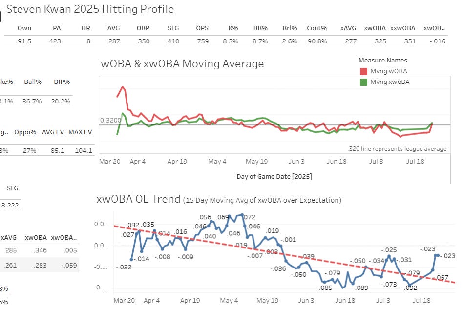 He now has a .287 average with eight homers and 11 steals. Similar production to Jordan Beck and Geraldo Perdomo. When you’re hitting so few homers and not stealing bases at an elite level, there’s just such pressure to hit for a super super high batting average. And Kwan has done that at times, but batting average is not a reliable stat, especially not for a guy who doesn’t hit the ball hard.
