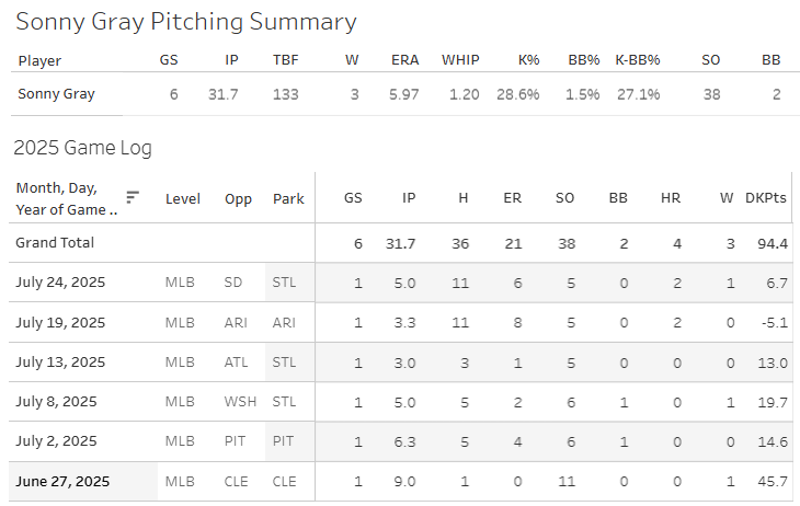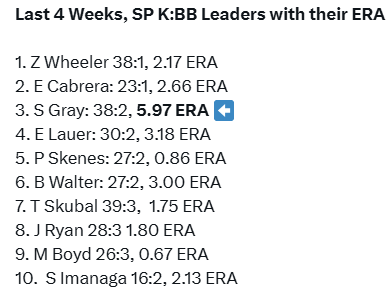 It’s really insane stuff. Gray has a 2.08 JA ERA and a 1.93 WHIP+ over these last 32 starts. He’s been elite under the hood, but everything else has worked against him. He’s given up a .364 BABIP and a 31% RISP H%. Those are both outliers. His 16% HR/FB is normal. He’s giving up hits at the worst possible times. His hard hit rate is only 38%, his xBA is only .269, and his xwOBA allowed is only .306. So you can’t even say he’s just getting smoked. Just one of the wildest runs of bad luck you’ll ever see. That makes him a great buy-low.