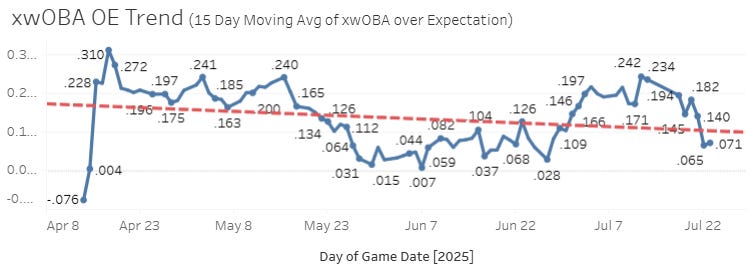 So that looks at xwOBA OE over the last 15 days, it does that every day, plots the dots, and then draws a line through them. And you can see the overall trend with the red dotted line.
