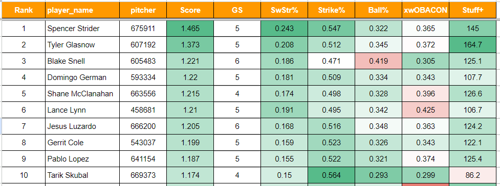 It’s weighted very heavily on SwStr%, which is how Strider can be at the top for a wide margin despite having given up a good amount of runs. The xwOBACON does factor in, but it’s weighted pretty low - since we know that’s not something a pitcher has a ton of control over. The link to that sheet is below the paywall and in the resource glossary page.