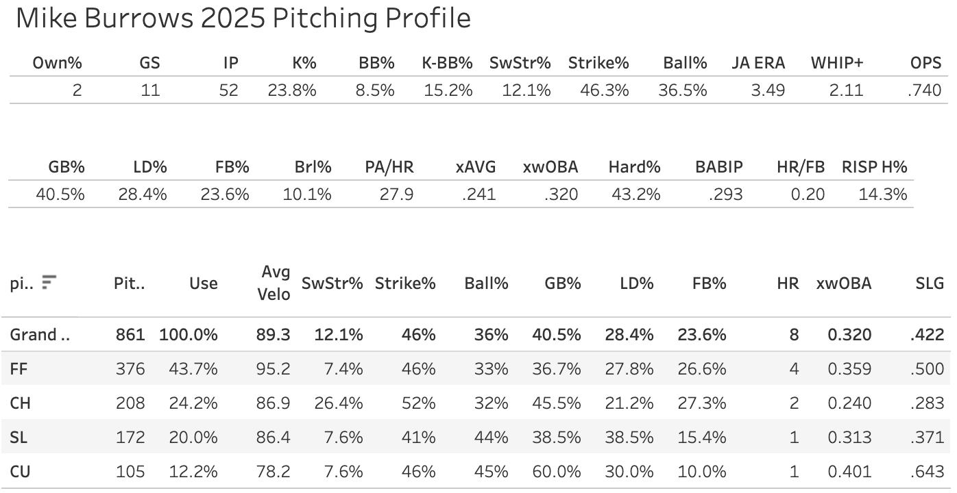Mike Burrows delivered six shutout innings against the Diamondbacks. He has done a lot of good things in the Pirates’ rotation this year. The K-BB% is decent at 15%, he gets a ton of whiffs with the changeup, and he has a nice four-pitch mix.